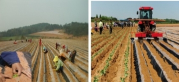 본밭에 심기가 끝나면 트랙터나 관리기 부착용 비닐 피복기를 사용해 덮어준다.