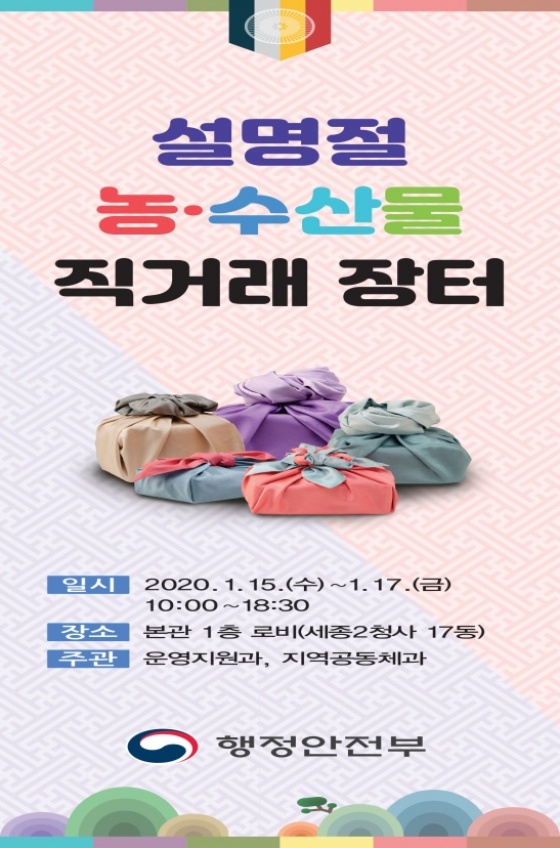행정안전부(장관 진영)가 판로에 어려움을 겪고 있는 농·수산물 생산 농·어업인 지원을 위한 설명절 맞이 농·수산물 직거래장터를 15일부터 오는 17일까지 3일간 행정안전부 본관(정부세종2청사) 1층에서 연다고 밝혔다.
