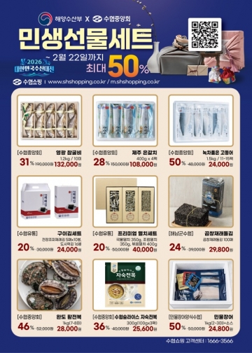 수협 온·오프라인 매장, 모바일 플랫폼(카카오톡 선물하기, 네이버 플러스 스토어)에서 설 기간에 저렴한 가격으로 수산물을 구입할 수 있는 ‘수산물 민생선물세트’도 마련하였다. 참조기, 갈치 등 제수용으로 많이 사용되는 품목과 전복 등 소비 촉진이 필요한 품목 위주로 구성하였으며, 최대 50% 할인하여 판매할 예정이다.