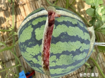 ▲수박= 집중호우 뒤 강한 햇빛에 의해 햇볕 데임 피해가 발생하기 쉽고, 토양 수분 변화로 열매 터짐(열과. 사진) 우려도 크다. 온도가 급격히 올라가지 않도록 열매를 신문지나 짚으로 덮어 준다. 뿌리 힘이 좋지 않을 때는 수분이 지나치게 많아지지 않도록 물을 조금씩 자주 준다.