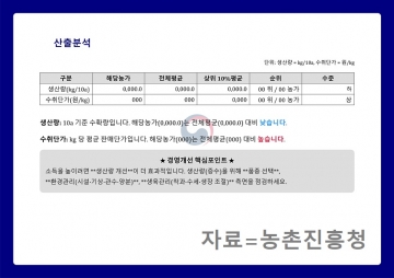 또한, 생산량·수취 단가를 평균 또는 상위 농가와 비교하고 항목별 경영비 투입 수준을 안내해 농가의 현 수준을 알 수 있게 했다.